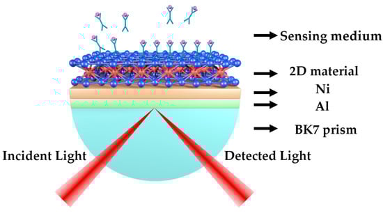 SPR sensor based on Kretschmann configuration comprised of BK7 prism, Al, Ni, 2D material, and external sensing medium is shown in Figure 1. The p-polarized light working at the wavelength of 633 nm is incident on the metal surface through the BK7 prism for the excitation of SPP at the 2D material/sensing medium interface, and the refractive index change of the sensing medium can be recorded by monitoring the reflected light with a coaxially reversed photodetector. The response and sensitivity of the SPR sensor are discussed by the angular interrogation method in this paper. The refractive index (RI) of the BK7 prism is calculated to be 1.5151 utilizing the equation as follows [23]: