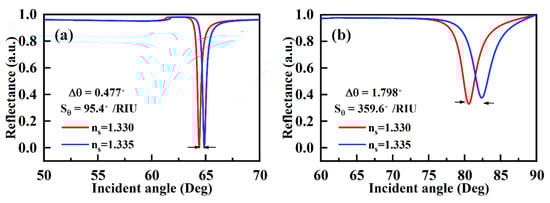 Δn represents the change of the sensing medium (∆n = 0.005). Δθ represents the change in resonance due to the change of the sensing medium. FWHM is the average angular variation corresponding to the maximum and minimum values of the SPR curve, reflecting the detection accuracy of the SPR sensor. To better understand the sensing performance of the SPR sensors, another intelligent scale of measurement called figure of merit (FOM) is applied to utilize the sensitivity and detection accuracy of the sensor and is represented by the following equation [37]:
