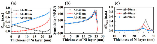 To further improve the performance of the SPR sensor based on the bimetallic film, the thickness of each layer should be optimized. The metal film plays a vital role in SPR sensing due to its significant influence on electric field enhancement. The sensitivity and minimum reflectance (Rmin) of the bimetallic SPR sensor for different thickness combinations of Al and Ni are shown in Figure 3. Rmin is a reliable parameter to reflect the response of SPP, and the small Rmin indicates that most of the incident light energy is transferred to SPP [40]. However, the sensitivity is not simply inversely proportional to Rmin as shown in Figure 3a,b.