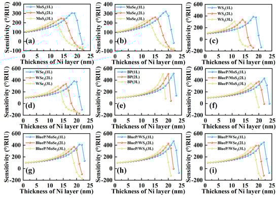 The sensitivity of SPR sensors with different 2D materials: (a) MoS2, (b) MoSe2, (c) WS2, (d) WSe2, (e) BP, (f) BlueP/MoS2, (g) BlueP/MoSe2, (h) BlueP/WS2, (i) BlueP/WSe2.