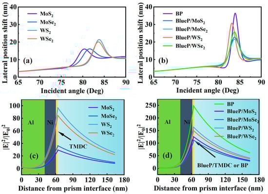 The lateral position shift of the proposed SPR sensor with (a) TMDC, and (b) BP and BlueP/TMDC. The electric field distributions of the proposed SPR sensor with (c) TMDC, and (d) BP and BlueP/TMDC.