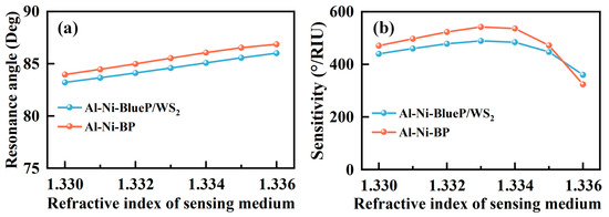 (a) Resonance angles corresponding to the different refractive index of sensing media for the SPR sensors with Al(40 nm)–Ni(22 nm)–BlueP/WS2(1 L) and Al(40 nm)–Ni(22 nm)–BP(1 L), (b) Sensitivity of SPR sensors under the refractive index of the sensing medium varying from 1.330–1.336 (∆n = 0.001).