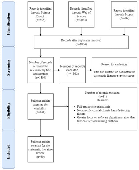 PRISMA diagram for the systematic literature review on low-cost sensors for monitoring coastal climate hazards.