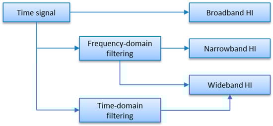 Continuous condition monitoring of rotating machinery is typically based on trend analysis, which relies on tracking of scalar indicators over time [1]. These scalar indicators, also called “health indicators” (HI) or “diagnostic features”, must therefore be predefined, as a part of CMS (Condition Monitoring System) configuration. Typical classification of scalar indicators differentiates among broadband indicators, wideband indicators, and narrowband indicators. Broadband indicators are these, which cover an entire signal spectral range. They include, for instance, peak-to-peak (PP) value, or zero-peak (ZP) value, root-mean-square (RMS) value, crest factor, and kurtosis. Narrowband health indicators are calculated from selected frequency/order bands, that is, from narrowband signals. Narrowband signals are obtained by filtering input signals with bandpass filters. These filters are applied either in the time domain or in the frequency/order domain; however, when relatively narrow bandpass filters are considered, the frequency/order domain filters are in favor. Such filtering boils down to selecting consecutive spectral indexes. Narrowband trends are widely used to track phase-locked components, like shaft components, gearbox components and rolling element-bearing components (local faults). Wideband indicators are such, which by an arbitrary decision cover a wide bandwidth. A typical example of a wideband indicator is velocity RMS (VRMS), because according to the ISO 20,816 standard, it is calculated from a velocity signal filtered either in the band 10–1000 Hz or 2–1000 Hz. This basic concept is illustrated in Figure 1.