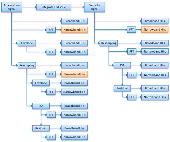 The analysis presented in this paper covers four different types of HIs, which are shown in Figure 2. Thus, the paper compares the proposed result with current practices, namely PP, RMS, VRMS, the shaft harmonic in the frequency domain and shaft harmonic in the order domain without proposed rational resampling. Comparative results are presented both qualitatively as well as quantitatively. All spectral HIs were calculated from full-resolution frequency/order spectra. If not stated otherwise, HIs were calculated from acceleration signals. Narrowband HIs were calculated as spectral peak values, that is, the maximum of spectral amplitudes from a specific bandwidth, here related to an output shaft. The complete list of investigated scalar indicators is given below: