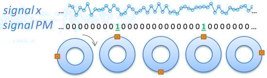 Resampling is a mathematical operation-transforming signal from the time domain to angle domain. Typically, it is used to reduce the negative influence of the variable machine speed on identification of spectral components of the analyzed signal. Let us consider a recorded vibration signal “x” and a phase marker signal PM recorded in parallel. The PM signal has a form [0 … 0 0 1 0 0 …. 0 0 1 0 … 0], where value “1” represents a consecutive shaft rotation. This idea is presented in Figure 3.