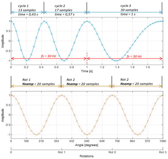 Top: signal sampled with constant sampling frequency, bottom: signal sampled with a constant number of samples per rotation.
