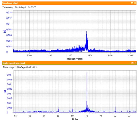 Figure 5 illustrates two spectra from a vibration signal recorded from a machinery working with variable speed. During the acquisition, machine speed varied in the range 1045–1100 RPM. The gear meshing component, which is equal to order 70, varied from 1219 Hz to 1283 in this time window, which makes it smeared in the regular spectrum, but clearly identifiable in the order spectrum, which is calculated from the resampled signal.