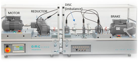 The test rig used in the experiment is illustrated in Figure 6. It is a drivetrain, which includes an input reference shaft driven by a 1.1 kW electrical motor, one-stage parallel gearbox, an output shaft, a set of rolling-element bearings, and a braking motor. The gearbox is a speed reductor with 23 teeth on the gear on the Input Shaft and 67 teeth on the gear on the output shaft, giving a total ratio of 23/67 = 0.34328. The bearings are generally spherical, with a double row roller 22,202 EK bearing. In order to introduce the gradually increasing imbalance condition, two round plates with multiple holes are installed on the output shaft.