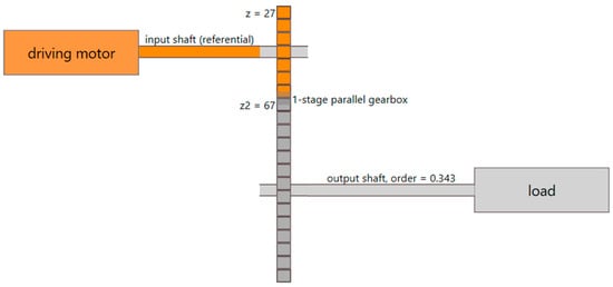 During the analyzed experiment, the test rig runs at 3000 RPM rotational speed (input shaft), and 50% nominal load, which is about 1.8 Nm. The kinetostatic configuration of the drive train is given in Figure 7.