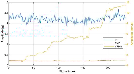 Figure 9 illustrates two broadband PP and RMS indicators along with the wideband VRMS indicator, while Figure 10 illustrates the trend of the three remaining narrowband spectral indicators.