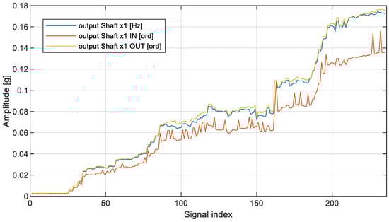 Column one in Table 1 defines the analyzed parameter. Column two refers to regular frequency spectrum data. The last two columns refer to the signal resampled with respect to the input shaft and output shaft, respectively. The nominal length of the signal in each case is the same and is equal to 10 s. The sampling frequency is not applicable to resampled data. The nominal number of samples is the same, which means that during the resampling process, the new number per samples per rotation is calculated as the average number of samples in rotation. In practice, in the case of a resampled signal, non-integer cycles are trimmed (here, less than 1%). The nominal speed of the input shaft is 3000 RPM (50 Hz), while the nominal speed of the output shaft is smaller by a factor of 23/67. Since the input shaft rotates 50 times in one second, it rotates 10 times more in 10 s. Analogously, the output shaft rotates 10 times more than in one second in each signal. The number of samples per rotation describes how many data points are nominally collected in each shaft rotation. Since the input shaft rotates faster, the number of samples per rotation is smaller. For individual shafts, the number of samples per rotation is calculated by dividing the total number of samples by the number of rotations. The same number of input shaft rotations and average number of samples per rotation are a coincidence resulting from the length of the signal, sampling frequency, and shaft speed. The individual number of samples per rotation limits the order bandwidth to its half. At the same time, the spectral resolution is the reciprocal of the number of rotations of each shaft, and is different for an order spectrum. Finally, as indicated in Table 1, although represented by the same spectral index, spectral components corresponding to individual shafts have different orders on order spectrums calculated with respect to the input shaft and the order spectrum calculated with respect to the output shaft.