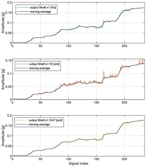 By comparing variances of data in Table 2, it might be concluded that the variance of narrowband output shaft order calculated with respect to the output shaft is nearly 17% smaller than the variance of the narrowband output shaft characteristic frequency calculated directly in the frequency domain and, at the same time, 75% smaller than the variance of the narrowband output shaft order calculated with respect to the reference input shaft (as typically met in industrial applications). A further investigation of the shape of the imbalance component in analyzed spectral representations points to a conclusion that order representation of spectral components might be undesired when performed with respect to a shaft with a rational transmission ratio, as is the case of the conducted experiment. As shown in Table 2, when resampling is performed with respect to the shaft of interest, the relative increase of shaft components is largely possible, and at the same time, the trend time series is characterized by the smallest possible variance, making technical diagnostics more reliable.