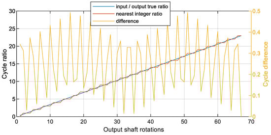 Ratios of cycles for the first 67 rotations of the output shaft.