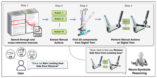 The proposed digital twin is created in 3D; therefore, it can be easily introduced into smart devices and virtual environments, including Augmented Reality (AR), Virtual Reality (VR), or Mixed Reality (MR), since the digital twin is represented in 3D. Moreover, with the help of NSR, a user wearing smart glasses or using a PC can query the system and receive a reply. Figure 1 illustrates the concept of the proposed reasoning. Once a user makes a request, NSR understands the query and searches and cross-references manuals, extracting relevant information for execution; it finds 3D assets of the digital twin mentioned in the maintenance documents and performs computed operations with visual feedback to the user. There are several steps involved in the proposed neuro-symbolic reasoning, which are described in the following sections.
