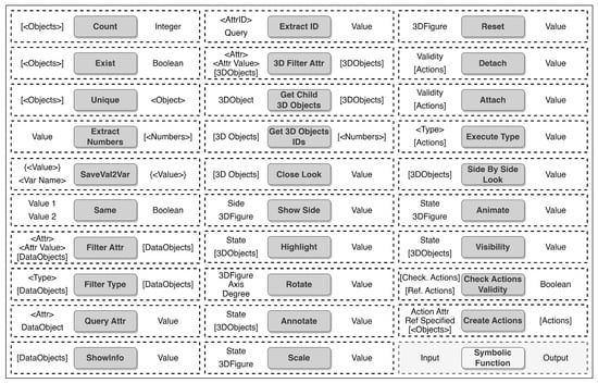 The proposed symbolic vocabulary represents operations that can be applied to the digital twin. The vocabulary consists of symbols that describe the digital twin’s functions and their possible configurations. Figure 3 illustrates the symbolic vocabulary built to interact with the aircraft maintenance digital twin. Overall, there are 30 operations, each with a specific purpose. The symbolic vocabulary consists of terminal and non-terminal symbols. Terminal symbols represent a final operation to be performed on the digital twin. In contrast, non-terminal symbols are used to retrieve or compute information for the functional parameters of a terminal node. The following are definitions of some terminal symbols: