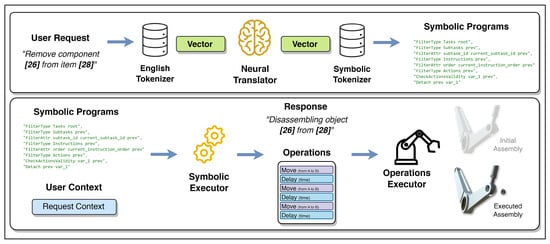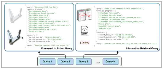 Overall, there are 9000 queries created. The queries are made by people and automation software written in Python, altering the various needs, contexts, conditions, and semantics of the language. The average number of symbols per query is 23.47, with a standard deviation of 10.46, and an average of 6.14 symbolic programs are constructed with a standard deviation of 2.48. Taking the example in Figure 4, the first query with the request “Disconnect [53] from [52]” is converted into 11 programs, whereas, the second sample query with the request “What is the content of this instruction?” is represented by 8 symbolic programs. The proposed requests reflect the functionality of the developed system when interacting with the digital twin. Our neuro-symbolic dataset addresses real-world problems and can be applied in industries that require the use of digital twins and document manuals. The proposed dataset is applied to build the neuro-symbolic interaction mechanism introduced in the next section.
