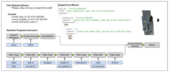 To better understand the execution of the symbolic programs, an example is provided in Figure 6. Assuming that the user request is “Please, show me how to install [43] to [46]”, which is a command-to-action query type, the neural translator generates the corresponding symbolic programs. In addition, the context of the request is provided, including information about the current task, its subtask, and the instruction order, which defines a specific manual process. A manual snippet of a given context is provided below.