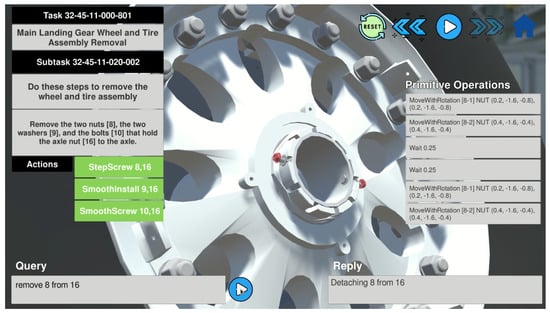 Digital twin interaction software is developed to allow users to make requests and explore the digital twin and neuro-symbolic datasets (see Figure 7). Users can choose a certain context in the aircraft maintenance digital twin such as a task, a subtask, or an instruction. Next, the system loads all the resources and presents the 3D digital twin and its specific parts in the software. Users can choose whether to automatically execute the actions of the context or make personalized requests. The digital twin interaction software is developed in Unity [45], which is a cross-platform game engine that supports a variety of desktop, mobile, and virtual reality platforms. Unity can be used to create 3D and 2D games, as well as interactive simulations and other experiences.