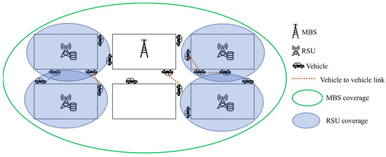 In the case of RSU and SBS, because they are fixed in one place, the content could be cached by installing RSU and SBS at a location where the vehicle stays for a relatively longer period of time. In [9], RSUs were installed at an intersection where the residence time of vehicles was long. By considering the amount of time the vehicle stays in the RSU, the number of vehicles staying in the RSU, and bandwidth, Ref. [9] decides whether to store the file chunk to maximize the hit probability. The vehicles download file chunks as they pass through the routes and recover the original file after they obtain all chunks. In [10], another caching method was proposed, in which the files were divided according to the vehicle movement to reduce the duplicated content and backhaul burden. Each RSU was installed in the direction in which the vehicle traveled, and the content size to be cached was determined based on the probability of the direction in which the vehicle moved. In [11], proactive caching was used to solve problems caused by vehicle mobility. This was because the mobility of vehicles significantly decreased the residence time in one RSU, thereby making it difficult for the vehicles to download the content. In addition, federated learning was applied to determine popular contents while protecting the personal information of the vehicle users. In [12], a caching algorithm was proposed to minimize the RSU cache update cost and file download cost. Because the speeds of vehicles and RSU file are different, two time-scale models were used. Ref. [12] determined the content popularity over time. This method maintained the balance between changes in the popularity and updates of contents.