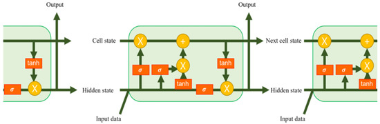 LSTM predicted the location of vehicles, and the number of vehicles located in the coverage of RSUs was calculated based on the prediction. In other words, LSTM is used to anticipate how many requests each RSU would have. The LSTM has the following characteristics. First, LSTM usually predicts the future data on sequential types solely from vehicle position data. Additional information such as the personal data of users is not required for prediction. Second, LSTM learns historical information better than Recurrent Neural Networks (RNN). Figure 2 depicts the structure of the LSTM. The gates present inside the LSTM cell decide whether to transfer the input information to the subsequent cell or not, so that both long- and short-term memories can be obtained. As an input to the LSTM, latitude and longitude coordinates of vehicle are used. The output of LSTM is the subsequent time location of the vehicle. Once the subsequent position is predicted for all vehicles, the number of vehicles located in each RSU in the future can be calculated.