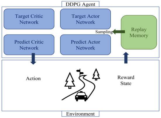 DDPG uses two types of networks: a critic network and an actor network. Figure 3 illustrates the architecture of DDPG. The critic network serves to evaluate the action based on the value of the action selected by the agent. As the agent interacts with the environment, it stores the observed state , selected action , reward obtained through the action, and new state in the replay buffer . The agent samples data in minibatches from the replay buffer to train the critic network. To update the critical network, it trains to reduce the difference from the output of the target neural network.