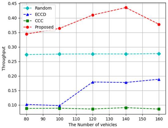 Figure 4, Figure 5 and Figure 6 depict the results of the measurement while changing the number of vehicles used in the experimental environment. As the number of vehicles increases, the requests for content increase, placing a load on the system. On the other hand, when the number of vehicles increases, the number of caching nodes increases, further increasing the space for caching content. Figure 4 depicts the result of measuring the caching node throughput while increasing the number of vehicles in the experimental environment. Compared to other algorithms, the proposed algorithm demonstrated the highest result because the agent of the proposed algorithm trains by considering the size of the content downloaded through caching nodes as a reward. In the proposed algorithm, when the number of vehicles is 160, the edge throughput decreased because more content was requested compared to what the system could handle. In ECCD, the throughput increases when there are 120 vehicles, and when there are more than 120 vehicles, it has a constant value. This means that when there are fewer than 120 vehicles, more content is delivered from the RSUs; however, when there are more than 120 vehicles, the amount of content delivered from the vehicle is larger than that of the RSU, resulting in an increase in throughput. At the same time, the number of vehicles requesting content also increased and there is no further increase in the total throughput. The Random and CCC methods were not significantly affected by the number of vehicles used. The reason is that Random does not consider the current situation. In the case of CCC, there are already enough vehicles in the environment; therefore, the number of vehicles does not affect the results. On average, the proposed algorithm performs approximately 1.4 times higher than Random, and approximately 2.7 and 4.3 times higher than ECCD and CCC, respectively.