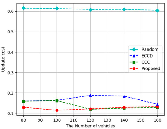 Figure 6 depicts the results of measuring the update cost according to the number of vehicles. In the case of the proposed algorithm and Random method, consistent results were obtained regardless of the number of vehicles. This implies that the update cost of each caching node is not affected by the number of vehicles, and the update cost of caching the RSUs and vehicles is constant. The proposed algorithm had the lowest cost, and the reason is that the proposed algorithm has RSUs and vehicles that rarely varied the cached content. However, ECCD tends to decrease when there are 160 vehicles and CCC tends to decrease when there are 120 vehicles or more, which means that the update cost in vehicles decreases when the number of vehicles increases. In ECCD and CCC, as the number of vehicles increases various contents could be accessed without updating the stored contents in vehicles because a large number of vehicles were used as caching nodes around the requestor. The proposed algorithm demonstrated an average reduction of approximately 79% with Random, about 24% and 8% with ECCD and CCC, in terms of update cost.