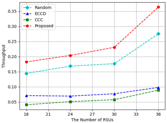 Throughput with respect to the increase in the number of RSUs.