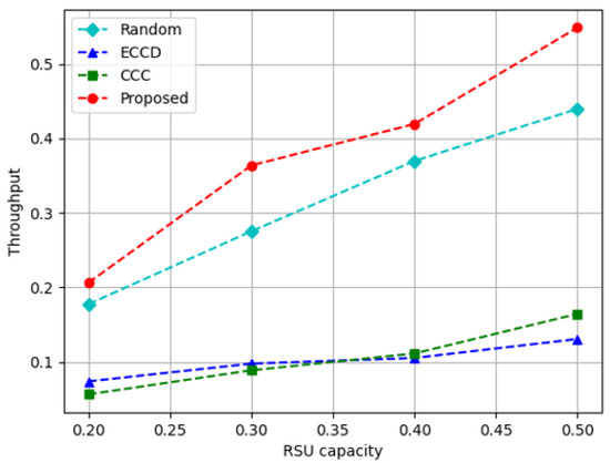 Figure 10, Figure 11 and Figure 12 depict the performance measured while increasing the storage capacity of the RSU. If the capacity of the RSU is large, there is a large amount of content that can be cached, but there is a limit to the size that can be transmitted within the constraint time. The capacity of the RSU is expressed as the ratio of the size that can be stored in the RSU out of the total size of the content in the content library. Figure 10 depicts the results of measuring the caching node throughput according to the increase in the storage capacity of the RSU. In the proposed and comparison methods, as the capacity of the RSU increases, the content stored in the RSU increases, and thus, the caching node throughput increases. Caching a small amount of content to larger size results in lower performance, such as ECCD and CCC. Relatively, the proposed algorithm and Random cache a large amount of content with a small size, which helps the requestors to obtain content from caching nodes. On average, the proposed algorithm increased performance approximately 1.2 times more than Random, approximately 3.6 and 3.7 times more than ECCD and CCC, respectively.