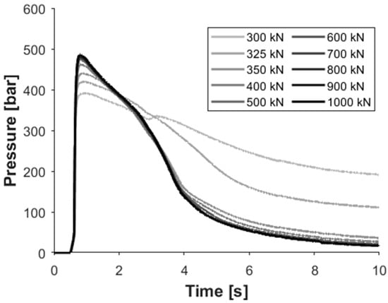 In-mold pressure change as a function of time at different clamping forces (cavity 04, post-gate sensor).