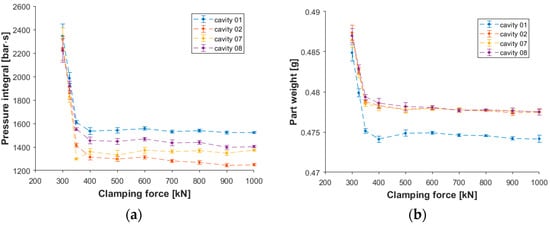 The change of the pressure integral (a) and part weight (b) of the inner (07 and 08) and outer (01 and 02) cavities due to a change in the clamping force.