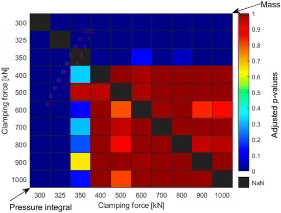 The adjusted p-values (from the Tukey–Kramer post hoc test) for each clamping force pair for the pressure integrals (below the diagonal) and part weights values (above the diagonal).