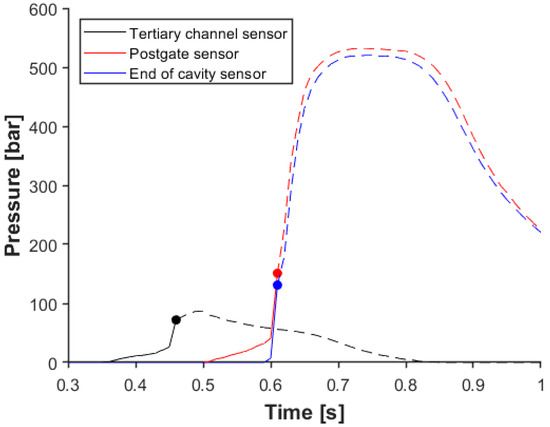 During the filling stage, the melt is injected from the barrel through the runner system into the cavity with a relatively high velocity. Melt pressure decreases during the path of the melt to the cavity. This raises the question: “Which pressure sensor location and which pressure threshold should be set as a switching control in the mold?” Theoretically, a small pressure signal from a sensor installed at the end of the cavity is enough to switch between the holding and filling stages. However, feedback from a sensor has a delay, which can cause higher in-mold pressure than necessary. We examined three different locations of pressure sensors along the melt path to determine the effect of this delay (see Figure 5). We used pressure sensors at a tertiary runner, after the gate of a cavity (post-gate sensor), and at the end of a cavity. We set the switchover pressure threshold to 50 bar. Still, due to the sampling rate of the sensor (100 Hz), the feedback signal was sent much later, especially for sensors towards the end of the flow path, and the machine also had a delay time. The solid lines show the pressure curves until the switchover, and the dashed lines show the in-mold pressure afterward. It is clear that even though there was no holding pressure, in-mold pressure increased significantly after the switchover if sensors inside the cavity controlled the machine. On the other hand, the sensor in the runner was able to take the pressure off. However, the melt did not reach the sensor at the end of the cavity, which meant an incomplete product.