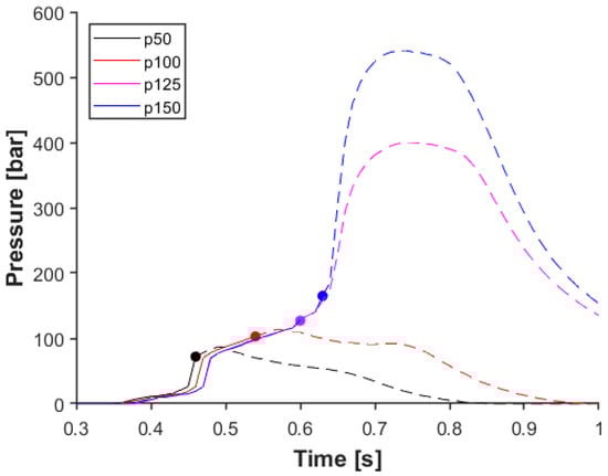 In the second (02—pressure-controlled SWOP), third (03—hybrid SWOP), and fourth (04—filling imbalance) experiments, we investigated the filling stage. The second experiment showed the advantages and disadvantages of switching based on in-mold pressure. In this experiment, the end of the filling stage was controlled using in-mold pressure. We used three different sensor locations and four different pressure thresholds to investigate the effect of these parameters on the SWOP. During this experiment, we did not use holding pressure so that we could investigate the pressure overflow in the mold. In this experiment, we sampled 15 pressure curves for each setting to make sure the switchover was stable.