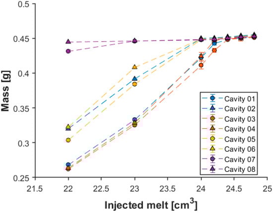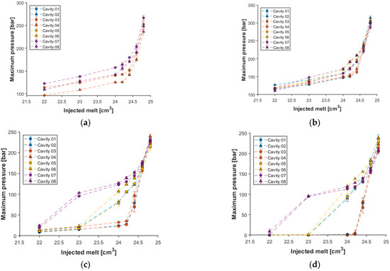 The mass measurement results (Figure 7) indicate that there is a significant difference in the filling between cavities 1 and 2. Subsequent gate measurements show that the gate at cavity 2 is about one and a half times the size of the other gates. This means a much lower resistance during filling, which results in a significantly greater product weight. From the mass measurement results (Figure 7), it is visible that when 22 cm3 of melt was injected, cavity 08 was already filled, while cavity 07 was almost filled. The sensors at tertiary channels cannot show the difference between the cavities connected to that channel (Figure 8a), which is a great disadvantage. The sensors in front of the gate can separate the individual cavities due to their position, but they cannot show the filling of the cavities either (Figure 8b). In contrast, the pressure data obtained from the sensors in the cavities clearly show that the melt flows differently in the individual cavities. The maximum pressure measured at the end of the cavity sensor shows this filling phenomenon the best because the maximum pressure in cavity 08 is already greater than zero when the volume of the injected melt is 22 cm3 (Figure 8d). The results of the post-gate sensors show a similar trend (Figure 8c). Figure 8c,d show that cavities 02, 05, and 06 are filled next due to the almost 100 bar maximum pressure jump. Cavities 01, 03, and 04 were the last to be filled when 24.5 cm3 of melt was injected into the mold. The sensors in the channel can show the filling of these last cavities as the slope of the maximum pressure function changes significantly from here. However, the in-cavity sensors demonstrate higher accuracy in this case. Therefore, in-cavity sensors are much more recommended for this method, while their use was less promising in the previous method.