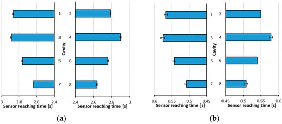 Melt arrival times to the end-of-cavity sensors: (a) vinj = 10 cm3/s and for (b) vinj =110 cm3/s (Tmelt = 215 °C).