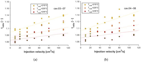 Effect of melt temperature and injection rate on the ratio of the longest and shortest melt arrival times: (a) cavity 03–07; (b) cavity 04–08.