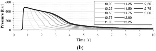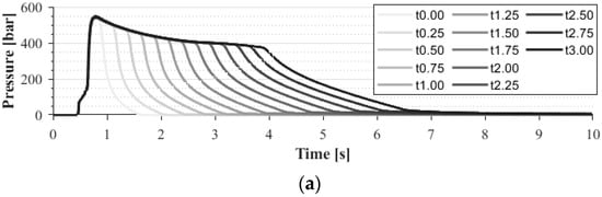 In-mold pressure curves as a function of time and holding time measured with a: (a) pre-gate sensor; (b) post-gate sensor (cavity 01).