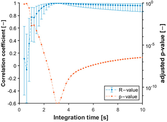 The changing of the correlation coefficients and their 95% confidence interval between the pressure integral and mass based on integration time and the adjusted probabilities for each correlation (cavity 08).