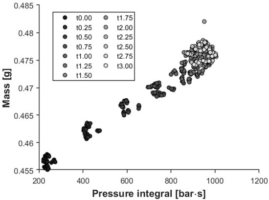 Therefore, the integral was calculated from the start of the measurement until the third second. We determined the Pearson correlation coefficient between the mass of each sample in the first eight cavities and the pressure integral measured from these cavities. The correlation coefficient is R = 0.973 with a significance level of α = 0.05 (Figure 13).