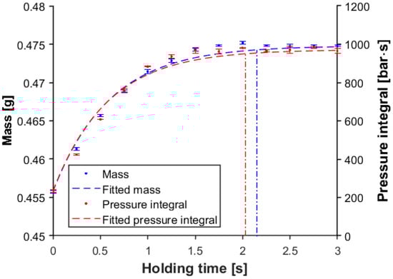 Mass and pressure integral as a function of holding time (cavity no. 1, post-gate sensor, phold = 600 bar, integration time 3 s).