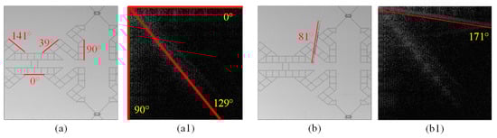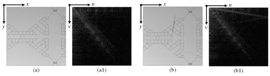 Figure 3(a1) is the energy spectrum image of the normal image in Figure 3a after DCT transformation. The background texture angles of the normal image in this space are about 4 directions (0°, 39°, 90°, 141°), but the energy spectrum image after DCT transformation has only 3 axes (0°, 90°, 129°), as shown in Figure 3(a1). Since the angle of 39° and the angle of 141° in the original image are complementary, the energy of the two angles (39°, 141°) is distributed in the direction 129° (39° + π/2) of energy on broadband in the discrete cosine energy spectrum image. Two images with the same background texture will have similar energy distributions, but in addition to the three more concentrated energy bands, the defect image obviously has one more energy band, as shown in Figure 3(b1). In the original defect image, a scratch produces a line at another angle, so at least one energy band is added to the discrete cosine energy spectrum, and the energy band on this energy spectrum image will be perpendicular to the original image’s defect direction.