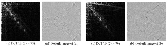 Figure 4 shows the process of performing threshold filtering on the discrete cosine energy spectrum image for the normal and defective images, respectively. If the energy spectrum values of the two frequency domains are greater than or equal to the threshold value of 70, then the energy spectrum values of the two frequency domains are deleted, and the corresponding positions of the frequency images are deleted together. The image rebuilding is completed by converting the frequency space back to the spatial space. To highlight the deleted positions in the energy spectrum images, the deleted positions in this study are shown in white (255).