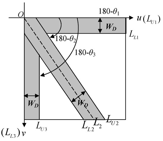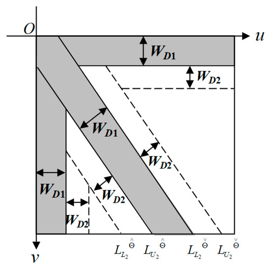 There are 3 main energy broadbands in different axes in the DCT frequency space image, so only 3 broadband intervals need to be cut in the DCT frequency domain. and are the upper and lower boundary ranges of each direction, respectively; are the coordinate positions in the frequency space image; and is the three different broadband angles in the frequency domain, where i = 1, 2, 3, are respectively , , and . The schematic diagram is depicted in Figure 5. In the discrete cosine frequency domain image, if a certain broadband range whose direction is , this satisfies Equation (5) as follows: