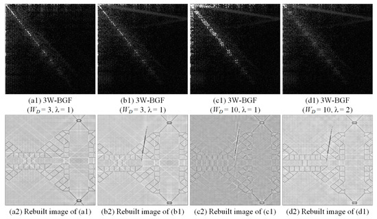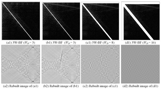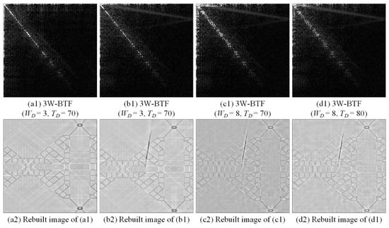 Figure 9 shows the filtering effects of the DCT three-way band-Gaussian filtering (3W-BGF) method with various cutting widths and energy threshold values. We discuss the influence of the same band energy threshold coefficient on the detection efficiency of different bandwidths and the influence of the same bandwidth on the detection efficiency of different band energy threshold coefficients. At the same band energy threshold coefficient, when the bandwidth is larger, more energy spectrum values are deleted. In the same bandwidth, the smaller the band energy threshold coefficient is, the more energy spectrum values are deleted. Therefore, the parameter combination of the bandwidth and the band energy threshold coefficient is very important and has a degree of impact on the detection effect.