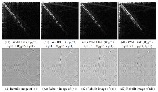 Figure 11 shows the filtering effects of the DCT-based 3W-DBGF method with various cutting widths and energy threshold values. We discuss the influence of the same band energy threshold coefficients (,) on the detection efficiency of different main band and sub-bandwidths (,) and the influence of the same bandwidth on the detection efficiency of the different band energy threshold coefficients. At the same band energy threshold coefficients, when the bandwidth is larger, more energy spectrum values are deleted. In the same bandwidths, the smaller the band energy threshold coefficients are, the more energy spectrum values are deleted. Although the structure of the background texture is destroyed to a large extent, the overall gray value of the image is reduced, and the entire image is darker. This does not significantly help blemish enhancement. Therefore, the parameter combination of the main band and sub-bandwidths and the band energy threshold coefficients is very important and has a relative impact on the detection effect.