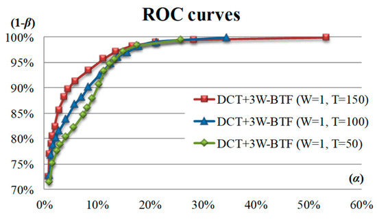In the DCT-based 3W-BTF method, the parameters of the band threshold filtering method are the bandwidth () and the frequency threshold (), and the influence of different two-parameter combinations on the detection efficiency is discussed. Figure 12 shows the detection effect ROC curves of the thresholds of 50, 100, and 150 using the DCT-based 3W-BTF method with a bandwidth of 1. The detection result shows that under a fixed α value and a fixed bandwidth of 1 pixel, the ROC curve with a threshold value of 150 is higher than the two ROC curves with threshold values of 50 and 100, thus indicating a larger detection rate (1 − β). Therefore, under the same bandwidth, the larger the threshold is, the less the filtered values and the better the detection result. Therefore, the detection effect is better when the bandwidth () is 1 pixel and the frequency filtering threshold () is 150.