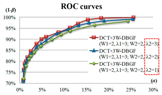 In the DCT-based 3W-DBGF method, the parameters of the double band-Gaussian threshold filtering method are the two sub-bandwidths () and the sub-band energy threshold coefficients , and the influence of different two-parameter combinations on the detection efficiency are discussed. Figure 13 shows the detection effect ROC curves of the values of 1, 2, and 3 using DCT-based 3W-DBGF method with three preset fixed parameters, (, ) = (2, 2) and ( = 3). The detection result shows that under a fixed α value and three fixed parameters, the ROC curve with a sub-band threshold coefficient of 3 is higher than the two ROC curves with sub-band threshold coefficients of 2 and 1, that is, there is a larger detection rate (1 − β). Therefore, the detection effect is better when the parameter combinations of sub-bandwidths and the sub-band energy threshold coefficients are ( = 2, = 3; = 2, = 3).