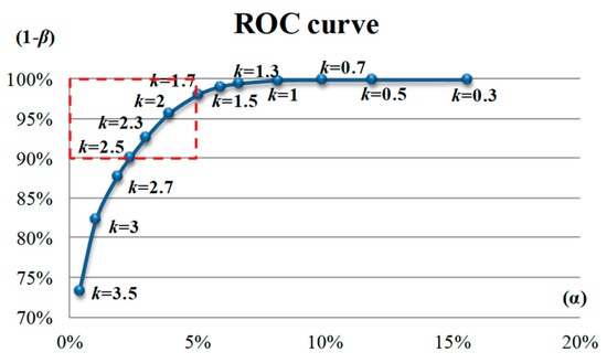 In the large sample experiments, 148 CTPs with a size of 256 × 256 pixels were used as testing images, of which 112 were defective images and 36 were nondefective images. The parameters of the DCT based 3W-DBGF method were set to ( = 2, = 3; = 2, = 3) to perform defect detection in the large-sample experiments. Figure 14 presents the ROC curve of the detection effect of different binarization thresholds (k) in the large-sample experiment. The k value closest to the upper left corner is a better k value. The k values in the box in Figure 15 from 2 to 2.5 all meet this standard, and the closest to the upper left corner is k = 2.3.